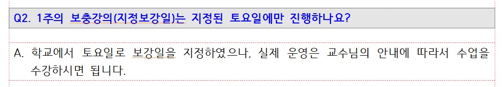수업결손으로 인하여 한주의 수업은 아래 교무처 지정일(매주 토요일)에 보강을 해야합니다.