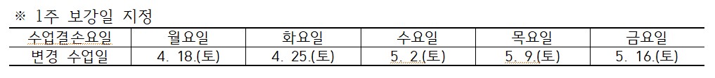 위 수업결손일(각 수업당 한 주)에 대해서는 on-site 토요일 강의가 아닌 LMS시스템을 이용하여 온라인 보강이 가능하기 때문에, LMS 사이트를 통해 수업대체과제를 공지할 예정입니다.