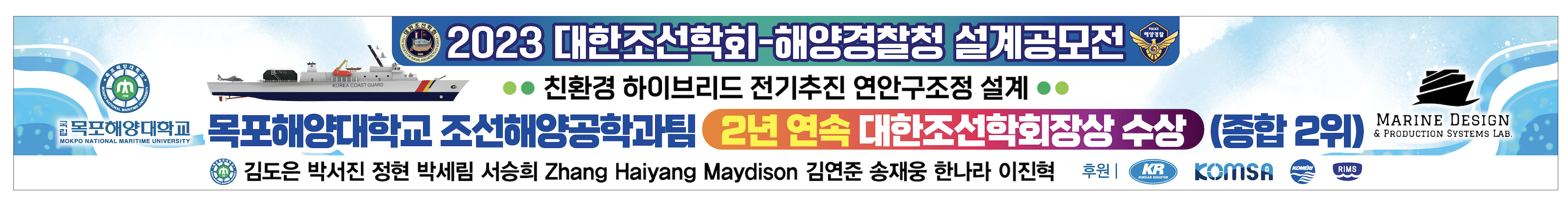 목포해양대학교(총장 한원희) 조선해양공학과(학과장 김병일) 선박해양설계연구팀(지도교수 오대균)은 (사)대한조선학회가 주관하고 해양경찰청이 주최한 설계공모전에서 종합 2위 대한조선학회 회장상(회장 이신형)을 수상하였다. 작년에 이어 2년 연속 수상이라 의미가 더 크다고 할 수 있다.
